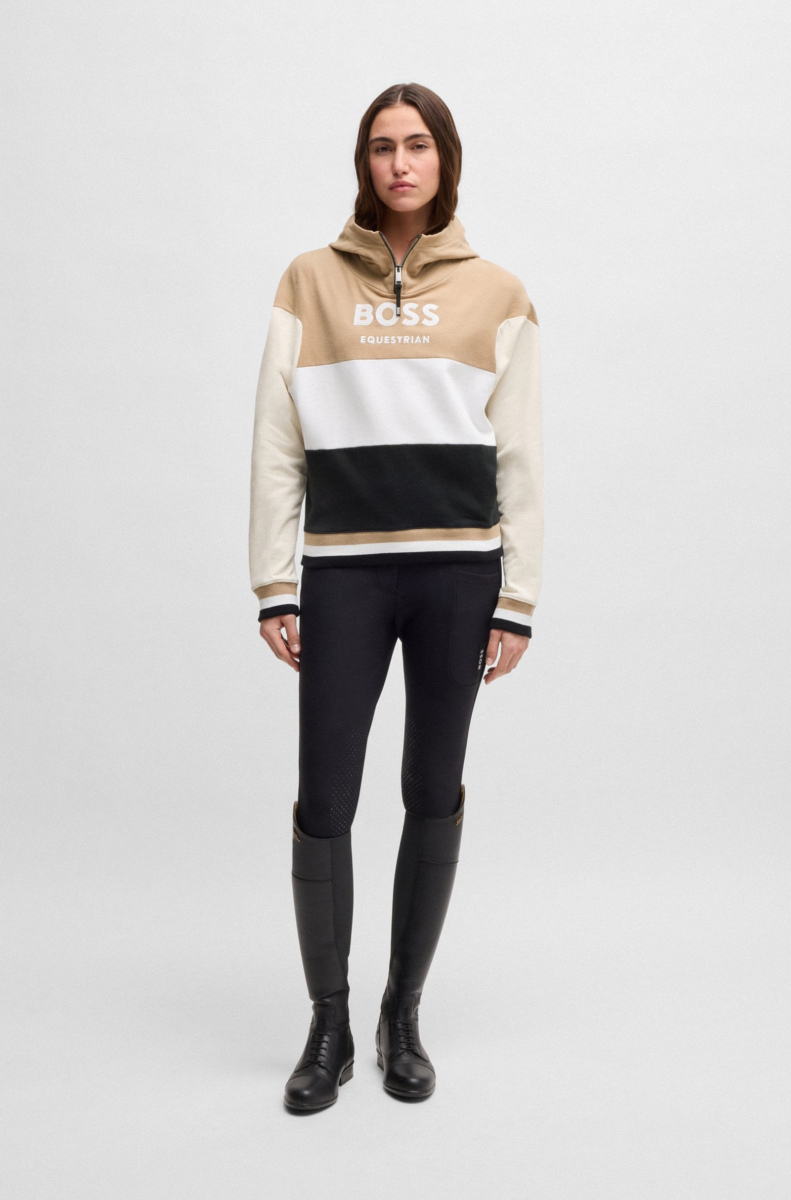 Questa felpa con cappuccio regular fit BOSS Donna rappresenta un classico del look casual grazie alle righe a blocchi di colore, al logo ricamato e al colletto con zip. Comodo pile realizzato in Italia in cotone elasticizzato.