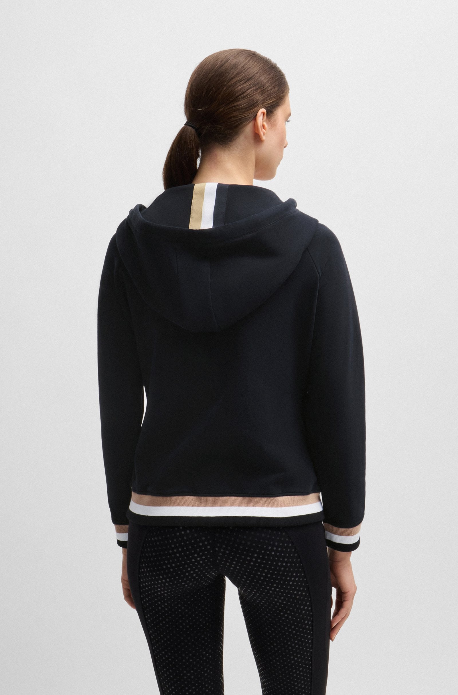Caratterizzata da un logo in tessuto sintetico rivestito, questa felpa con cappuccio e zip BOSS Donna è perfetta per i look da equitazione a strati. Rifiniture con le righe tipiche del marchio. In cotone elasticizzato italiano. Il tessuto sintetico rivestito, chiamato in alcuni casi similpelle, è progettato per assomigliare alla vera pelle e presenta un effetto rivestito opaco, lucido, liscio o lavorato.